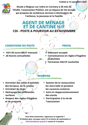 L'association Puzzle recrute un agent de ménage et de cantine en CDI à partir du 3 novembre 2025.