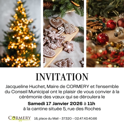 Mme Jacqueline HUCHET, Maire, et l'ensemble du conseil municipal ont le plaisir de vous convier à la cérémonie des vœux qui se déroulera le samedi 17 janvier 2026 à 11h à la cantine située 5, rue des Roches.