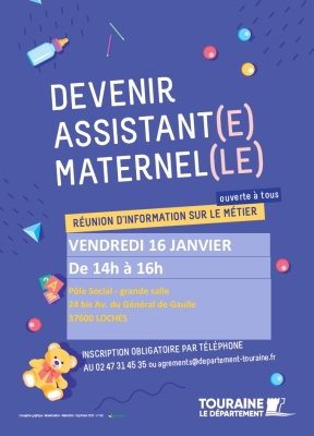 Le département, en partenariat avec le Relais Petite Enfance, organise une réunion d’information à propos du métier d’assistant(e) maternel(le) : vendredi 16 janvier à 14h à Loches.