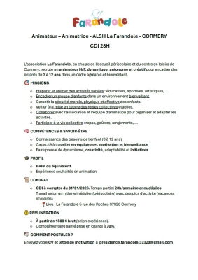 Lien vers l'annonce : https://www.cormery.fr/pdfs/Animateur%20Farandole%200126.pdf