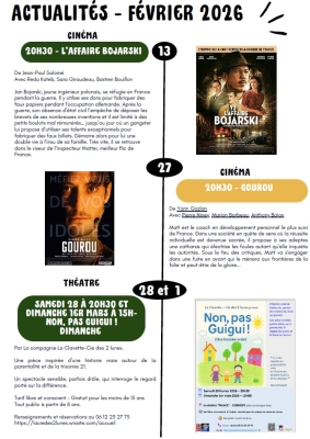 Souhaitons de beaux moments de culture : cinéma, théâtre, festivals .... et autres évènements, au sein de notre village.