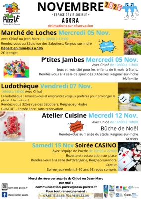 Nous sommes heureux de vous partager le programme des animations pour le mois de novembre à l’Espace de Vie Sociale de Reignac-sur-Indre.